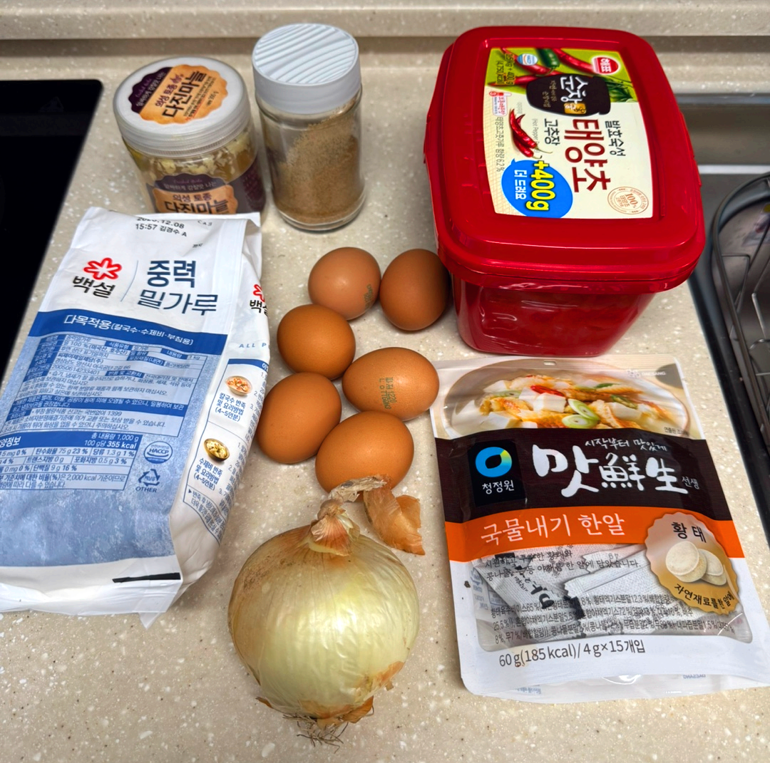 보조재료 : 감자, 애호박, 계란, 파, 국 간장, 황태, 멸치, 사골 육수 등등